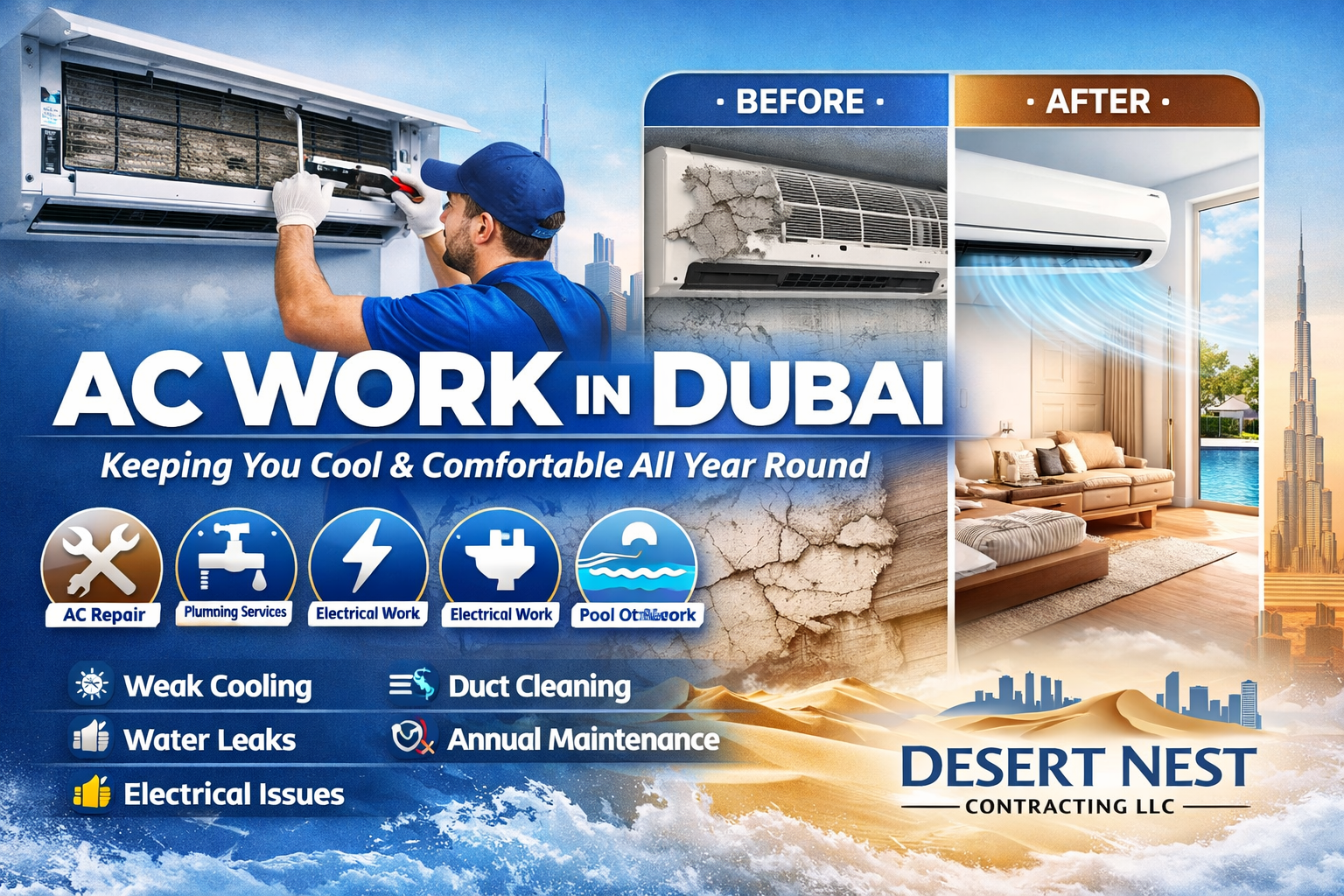 Let’s be honest—living in Dubai afterwards a appropriately activity air conditioner is about impossible. With temperatures aerial aloft 40°C for abundant of the year, your AC isn’t aloof a luxury—it’s a lifeline. Whether you’re a homeowner in Jumeirah, a alcazar citizen in Arabian Ranches, or managing a business in Downtown Dubai, you’ve apparently accomplished the annoyance of anemic cooling, aberrant noises, or skyrocketing DEWA bills. In this blog, we’ll breach bottomward why AC Work is so important, what accepted issues to attending out for, and how Desert Nest Contracting LLC can advice you breach air-conditioned and adequate all year round. Along the way, we’ll additionally appearance you how AC casework affix with added capital offerings like Plumbing Services, Electrical Services, Swimming Pool maintenance, and more.